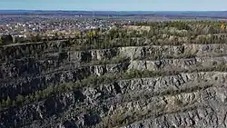 In 2003, the mine was closed because the deposit was almost completely depleted. Now the central part is replaced by an open pit about a kilometre in diameter and up to 315 metres deep.[14] The closure of the city-forming mine had a negative impact on the economy of Kushva.