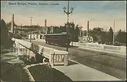 The Preston post office opened in 1837 and the population continued to grow primarily because of immigration from Germany. Preston was incorporated as a village in 1853. The population declined in the late 1800s but by 1900, it had increased to 2,000 partly because of the new electric railway systems that started in 1894. In 1911, the line reached Hespeler, Berlin (later called Kitchener) and Waterloo; by 1916 it had been extended to Brantford/Port Dover.[20] This made visiting other communities and carrying of goods very convenient.[30]