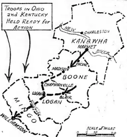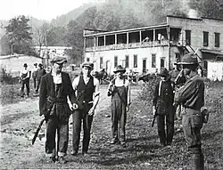 For five days from late August to early September 1921, some 10,000 armed coal miners confronted 3,000 lawmen and strikebreakers (called the Logan Defenders)[6] who were backed by coal mine operators during the miners' attempt to unionize the southwestern West Virginia coalfields when tensions rose between workers and mine management. The battle ended after approximately one million rounds were fired,[7] and the United States Army, represented by the West Virginia National Guard led by McDowell County native William Eubanks,[8] intervened by presidential order.[9]