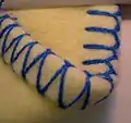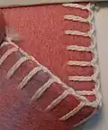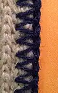 This stitch has long been both an application by hand and as a machine sewn stitch. When done by hand, it is sometimes considered a crochet stitch, used to join pieces together to make a blanket or other larger item. It is used in sewing leather pieces together, as traditionally done by indigenous American cultures,[2] and even for weaving basket rims. The whipstitch is also a type of surgical suturing stitch.[3]