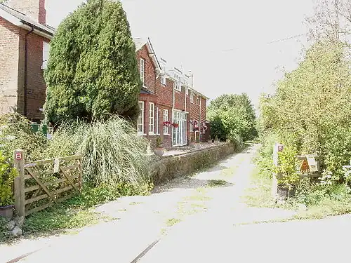 Parliamentary authority to extend the Wycombe Railway's single track line beyond Princes Risborough to Oxford was given on 28 June 1861.[4] Thame was reached by 31 July 1862 and a regular service from Paddington via Maidenhead began the next day. Four daily trains each way (one on Sundays) called at Thame, Bledlow, Princes Risborough, West Wycombe, High Wycombe and Maidenhead.[5] Bledlow station was west of a level crossing on Sandpit Lane, 1 mile (1.6 km) from the village from which it took its name. A two-storey brick station building was built at Bledlow at a cost of £1,003-13s-6d.[6] It included a booking office and accommodation for the station master.