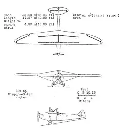 All together, the fineness of the aircraft was 17 when the wheels were cowled; it could reportedly be increased to nearly 19.5 by eliminating the undercarriage.[4] Alternative models, including a rectangular and an elliptical configuration, were studied. The propeller was lowered as much as was practical to be done, which brought the slipstream beneath the wing; the distance between the propeller and the leading edge of the wing was only four meters (13.12 ft).[4] The structure of the fuselage comprised a ventral keel and a pair of upper longerons; the transverse structure comprised a series of bulkheads and intermediate frames; the spaces between these objects were occupied by formers. The fuselage covering was load-bearing, consisting of three layers of whitewood strips that were both glued and nailed to the framework along with a fabric covering; the exterior was fairly smooth, resistant to torsion, and exhibited none of the bulging common to plywood construction.[5]