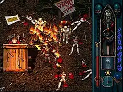 Central influences included vampire mythology, William Shakespeare's plays, themes of ethical dilemma in the film Unforgiven, the visceral qualities of the Necroscope novels, and the intricate plot of The Wheel of Time book series.[3][17] Although antiheroes were previously uncommon in action-adventure games, Silicon Knights rejected concerns that the character of Kain was too unconventional and the story too ambitious.[44] The developers endorsed the narrative motif, "what is evil? Perhaps it is merely a perspective", and hoped to determine how players would react in "a world where [they] had to kill innocents to survive".[3][17][45] McCulloch, who wrote the majority of in-game texts, was urged by marketer colleagues to give characters more accessible names—he described some, such as Mortanius, as "Names from Hell", which were difficult to get past the "marketing censor".[46] Cover art for the historical novel The Pillars of the Earth served as the inspiration behind the Pillars of Nosgoth.[3] The Soul Reaver sword, which was originally conceived as a weapon for Too Human, was transferred to Blood Omen's fictional universe, and would become a mainstay weapon in subsequent games in the Legacy of Kain series.[40][47]