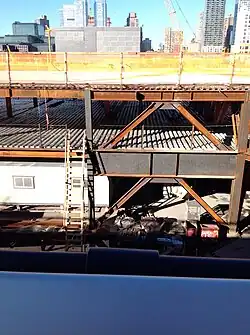 Construction of the Shed over the West Side Yard, began after caissons were sunk to support a platform over the tracks.[21] The platform supporting the towers, comprising 16 bridges, was completed in late 2014.[22] The construction of the building itself began in mid-2015.[16][23] The name of the space was changed to simply "The Shed" in 2016.[24] The retractable shell was completed by 2017.[25][26] Although early reports stated that the building would open in 2017 or 2018,[27] a 2015 report placed the opening date at 2019.[28] As of May 2017, the pace of construction indicated that the Shed was projected to open in either 2018[29] or 2019.[30]