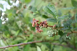Blueberry shock virus is pollen-borne and likely infects during pollination.[2] Bees and other pollinators are the main vectors for the virus. Insects that do not act as pollinators, such as thrips and several types of flies, are not known to transmit the disease. The virus can spread quickly once established in the field.[3] Once infected, the plant suffers from flower and leaf blight and dieback.[2] Symptoms begin to appear just prior to bloom and can continue to develop during bloom.[3] Eventually, after one to two years the shoots grow back and the infected plant may regain fruit production again.[2] When the plants fully recover, they once again produce a full crop.[1] However, their pollen will continue to be a source of inoculum and spread the virus to other blueberry plants, making it difficult to control.[2] Management of the disease involves preventing introduction of the virus to non-infected plants. Suckers and plant material should be tested for the virus before introduction into a nursery or field. If plants do become infected with the disease either the few plants infected can be removed and burned or the whole field may need to be. Herbicides are also sprayed to ensure that the root is killed, leaving no infected suckers in the ground. Research has shown that yields are not significantly affected in recovered bushes.[3]