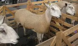 The Bluefaced Leicester is a British breed of longwool sheep. It originated in north-east England in the late nineteenth or early twentieth century, and derives from the white-faced Border Leicester, with some influence from the blue-coloured Wensleydale and possibly also from the Teeswater.[4]: 765 It was bred specifically for use as a terminal sire to be used on ewes of hill sheep breeds to produce mules. By about 1920 it was known either as the Bluefaced or as the Hexham Leicester, for the town of Hexham in Northumberland.