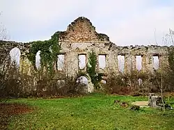 Boštanj Castle (Slovene: grad Boštanj, German: Weißenstein) stands on the foundations of a Roman fortification.[3] It was built up in the mid-16th century by Jacob von Lamberg. In 1678 ownership was assumed by the Ursini von Blagay family, who remained the owners until the beginning of the 20th century. It was a Renaissance castle designed like a fortress with a central rectangular building fortified with towers and a defensive wall.[6] The castle contained many late Gothic and Renaissance architectural elements, and also featured valuable Rococo and Classicist murals and ceiling paintings.[3] During the Second World War, after forcing besieged White Guard forces at the castle to withdraw to Turjak Castle,[7] the Partisans plundered and burned Boštanj Castle on 12 September 1943.[3][8] The castle burned for 14 days and the local fire department was forbidden from extinguishing the fire.[9]