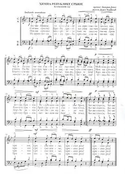 "Bože pravde" (Serbian: Боже правде, Serbian pronunciation: [bǒʒe prâːʋde]; 'O God of Justice')[6] is the national anthem of Serbia, as defined by the Article 7 of the Constitution of Serbia.[7] "Bože pravde" was adopted in 1882 and had been the national anthem of the Kingdom of Serbia until 1919 when Serbia became a part of the Kingdom of Serbs, Croats and Slovenes.[8] It was re-adopted as the national anthem at first by the parliamentary recommendation in 2004 and then constitutionally sanctioned in 2006, after Serbia restored its independence.[9]