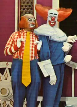 In 1960, station management asked the character actor and staff announcer to portray Bozo on a live, 30-minute show weekdays at noon, consisting of one-man sketches and cartoons, which debuted on June 20, 1960.[9] The show went on hiatus in January 1961 to move from studios at Tribune Tower to new studios at 2501 West Bradley Place, near the Lane Tech High School campus. Thus, Bozo evolved into Bozo's Circus on September 11, 1961, as a live, hour-long telecast. At the same time Bell was hosting WGN's after school Three Stooges show from 1959 where he played an old man named Andy Starr who ran a neighborhood theatre called the Odeon where he showed the Stooges shorts.[2] The show ran for nine years with Bell as the host and also as Bozo.[10][11][12][13]
