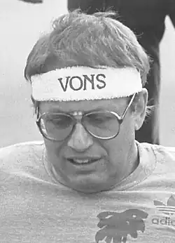 In November 1986 he completed the New York City Marathon, taking four days to complete the 26 miles (42 km) race.[3] He "ran" across America on his hands, taking three years, eight months, and six days to travel from coast to coast and raise money for Vietnam war veterans.[4] In 1988 at 41, he finished the Los Angeles Marathon, taking 74.5 hours to finish the 26.2 miles (42.2 km) race. He started the race a day earlier than everyone else and finished two days after the last runner had crossed the finish line.[5]