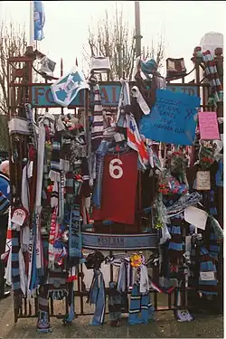 The first West Ham home game after his death was on 6 March 1993, against Wolverhampton Wanderers. The Boleyn Ground was awash with floral tributes, scarves and other football memorabilia from West Ham fans and those of other clubs. Fellow 1966 World Cup winners Geoff Hurst and Martin Peters placed a floral replica of a West Ham shirt, showing Moore's number, 6, on the back, on the centre spot before the game. West Ham rested the No. 6 for the game, with the regular No. 6, Ian Bishop, wearing No. 12. The game was won by West Ham 3–1: Trevor Morley, Julian Dicks and Matty Holmes scored for West Ham, Steve Bull in reply.[46]