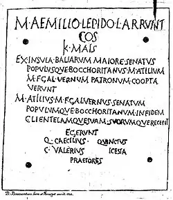 M. Aemilio Lepido, L. Arruntio | co(n)s(ulibus) k(alendis) Mais. | Ex insula Baliarum Maiore senatus | populusque Bocchoritanus M. Atilium M. F. Gal(eria) Vernum patronum coopata | verunt | M. Atilius M. F. Gal(eria) Vernus senatum | populusque Bochoritanum in fidem | clientelamque suam suorumque recepit. | Egerunt Q. Caecilius Quintus | C. Valerius Icesta praetores