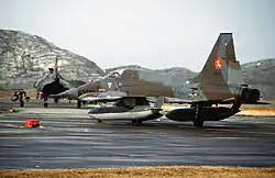 In an effort to rationalize operations and renew the fighter inventory, Norway took delivery of twenty-two used CF-104 Starfighters from the Royal Canadian Air Force. These were stationed with the 334 Squadron in order to exploit commonality with the F-104s already stationed in Bodø. Unlike the F-104, the CF-104 was built as a fighter-bomber, but radar was retrofitting before entering Norwegian service. The aircraft's primary role was naval bombardment.[61] During larger exercises, the 334 Squadron would routinely relocate to Bardufoss.[62] Bodø became one of nine co-located operating bases (COB), following an agreement between the Norwegian Armed Forces and the USAF in May 1974. This involved permanent storage of ammunition, parts and equipment, as well as a tighter organizational cooperation, with the USAF.[63]