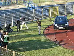 The work of a bodyguard consists mainly of planning routes, pre-searching rooms and buildings where the client will be visiting, researching the backgrounds of people that will have contact with the client, searching vehicles, and escorting the client on their day-to-day activities.[1] In the event of an emergency, a bodyguard's priority will always be to evacuate their client, rather than engage with threats.[2]