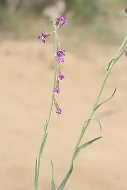 A long-lived perennial, it is usually 300–750 mm (12–30 in) tall from a woody base. Eight to twenty purple, rarely white, flowers are borne in a normally unbranched raceme. Petals are 9–16 mm (0.4–0.6 in) long and 2–5 mm (0.08–0.20 in) wide. Sepals are hairy.[4]