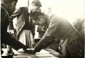 Between November and December 1941 Aung San and his party were successful in recruiting approximately 3,500 Burmese volunteers from the Siam-Burma border to serve in their army. On 28 December 1941, Aung San and the rest of the Thirty Comrades formally inaugurated the Burma Independence Army in Bangkok.[24] The event involved the thwe thauk ("blood drinking") ceremony, a tradition inherited from the Burmese aristocracy.[27] The participants collected their blood from a cut in their arms, mixing the participants' blood together with alcohol in a silver bowl, and drinking it while pledging eternal comradeship and loyalty. Three days later the BIA entered Burma behind the invading Japanese Fifteenth Army.[24] The BIA left most of the fighting to the Japanese Army but occupied the areas behind Japanese lines after the British had retreated. The arrival of BIA units in many areas of Burma was followed by escalating communal violence, especially against Karen people and others who held privileged positions and whom they believe to have oppressed the Buddhist Burmese during the British administration. The violence lasted for several weeks until the Japanese Army intervened.[28]