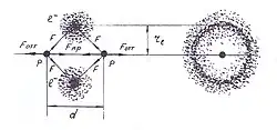 According to his model for a diatomic molecule, the electrons of the atoms of the molecule form a rotating ring whose plane is perpendicular to the axis of the molecule and equidistant from the atomic nuclei. The dynamic equilibrium of the molecular system is achieved through the balance of forces between the forces of attraction of nuclei to the plane of the ring of electrons and the forces of mutual repulsion of the nuclei. The Bohr model of the chemical bond took into account the Coulomb repulsion - the electrons in the ring are at the maximum distance from each other.[2]