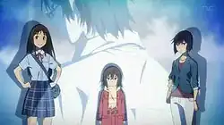 | Satoru and his friends approach Aya, and despite some initial resistance, she starts joining them at their hideout. Later, Satoru shadows Misato Yanagihara, who has kept to herself since being accused of framing Kayo. She seemingly disappears after going to the bathroom. Satoru then notices a truck belonging to Yuuki's family leaving the scene and he asks Yashiro to follow it in his car. Along the way, Yashiro reveals himself to be the killer and that he realized that Satoru was the one thwarting his plans. He explains that he used Misato as bait to lure Satoru into the stolen car, which he then rolls into a frozen lake with Satoru trapped inside. | ||||||