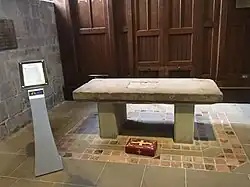 A stone altar in the north aisle was preserved at the time of the Dissolution by using it to cover the second of the crypts mentioned above. When the floor was re-laid in 1867 it was placed in the floor of the west tower, and subsequently moved into the church where for nearly a century it was propped against the north wall of the aisle.