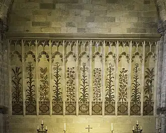 A Painted Wall remains as a backdrop to the altar. The plants and symbols depict various aspects of the biblical and Christian narrative. Hidden in the design are the artist's signature and bishops’ crooks and fish symbols. It was not universally popular, and at the instigation of a Duchess of Devonshire (or, according to another version, of her Royal visitor) it was for many years concealed behind a specially commissioned curtain.