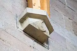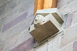 Over the doorway of the West Tower there is an original inscription bearing the Prior's symbol (a moon) and stating that he ‘began this foundacyon in MCVXX’. It is flanked by models of hounds, which may be an allusion to the Prior's duties as Master Forester or a play on the name of the husband of the Foundress, William Meschin (mes chien).[8]