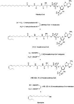 A desaturase enzyme encoded by the gene Bmpgdesat1 (Desat1), produces the monoene (11Z)-hexadecenoyl-CoA as well as the diene (10E,12Z)-10,12-hexadecadienoyl-CoA. This desaturase is the only enzyme necessary to catalyze these two consecutive desaturation steps.[8]