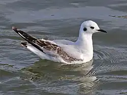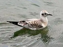 The juvenile plumage, usually only seen on the breeding grounds, is scalloped brown on the back, and patchy brown on the head; they moult into first-winter plumage in August mostly before migrating south.[15] First year birds are more like the adults with a grey back, but retain a brown bar across the forewing, blackish tips to the secondary feathers, and a black tip to the tail; they have the same plumage in winter and the following summer, but the summer plumage is paler due to wear and fading. Fewer than 5 percent of Bonaparte's gulls acquire a dark hood in their first summer, and on those that do, the hood is duller than on breeding adults.[15] Two-year old birds mostly gain full adult plumage, but a few retain signs of immaturity such as brown spots on the forewing and dark tips to some of the tail feathers.[15]