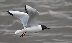 The most similar potential confusion species is the Old World black-headed gull, which each being a regular, though scarce or rare, winter visitor within the wintering range of the other. They can best be distinguished by the smaller size of Bonaparte's gull, its slenderer, darker bill, pale grey rear of the neck, pinker legs, and in flight, by the conspicuously whiter underwing, lacking the dark uderside of the primary feathers of black-headed gull.[15] Little gull can also be confused in immature plumages; it is even smaller than Bonaparte's gull, and the dark bar on the forewing of year-old birds is black, not dark brown. Adult little gulls, with their uniform pale grey upperwing and blackish underwing, are far less likely to be confused.[15]