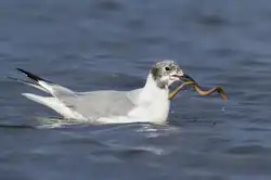 Like most gulls, Bonaparte's gull has a varied diet, with prey items changing over the course of the year, and from year to year. During the breeding season, it is largely insectivorous.[24] It is known to quickly congregate in large numbers to take advantage of termite dispersal flights, circling over the emerging swarm and hovering briefly to take the insects in flight.[25] It also gathers in large numbers to feed on the eggs of spawning salmon, alighting on the water and, if necessary, diving to take drifting eggs.[26] During migration and into the winter, insects are first supplemented, then replaced by other food items, including fish, small crustaceans, mollusks, euphausiids, marine worms, and other invertebrates.[24] At least one immature bird has been recorded as having fed on walnut meat.[27] Bonaparte's gulls are known to engage in kleptoparasitism, and have been observed stealing earthworms from foraging dunlins and black-bellied plovers.[28]