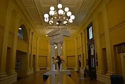 The interior was reconfigured to serve its new functions as an architecture building and to correspond with its original classical character. The main lobby became an exhibit hall, flanked on the north by the Architecture Library and on the south by a new lecture hall. The basement contained a darkroom and classrooms, and the mezzanine and second floor were converted into classroom space. The renovation itself was a learning experience for the architectural students.[7]
