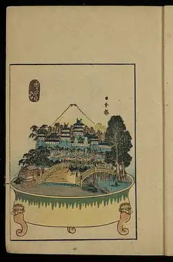 In 1848, a relatively unknown artist named Utagawa Yoshishige (歌川芳重) created and published a book of colored prints depicting bonkei specimens, titled Fifty-three Stations of the Tōkaidō as Potted Landscapes (Tokaido Gojusan-eki Hachiyama Edyu). Each bonkei piece was designed and created by Kimura Tōsen for Utagawa Yoshishige to depict,[5][6] and the book's introduction was written by Kimura Tōsen's son.