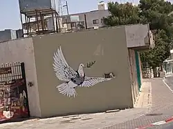 The anonymous, UK-based artist, Banksy, is a prominent figure in the way individuals have used the separation wall as surface to express their dissent for its establishment. He has used the dimension of the wall, the division it represents, and the context behind it to make works that succeed in their environment. One of his more popular works depicts a dove, a symbol of peace, juxtaposed with it wearing a bullet-proof vest. Here, it can be inferred that Banksy is trying to express that there is a want for peace between the two nations, yet given the history of violence, they must be prepared for conflict. Essentially, he is demonstrating the fake sense of peace that is being generated as a byproduct of this wall.
