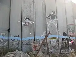 There have been several artists from other countries who have come to the Israeli West Bank barrier and used the wall itself as a canvas to express their condemnation of its establishment. They have worked in hand with local Palestinian street artists as well to express their sentiments and ultimately get across their message.[15] These much more well known international artists have also aided in turning the public eye to the conflict that is occurring between Palestine and Israel. Many of the artists that work on the separation barrier have taken something that is perceived as an instrument of division and thus turned it into the canvas in which they create their message.