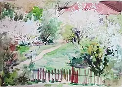 Boris Ginsburg is also concise and even fragmentary in his landscapes-miniatures. What is meant here is not size. A little forest clearing, lonely oak trees or pines on the edge of a meadow, a delicately lacy tree brunch in early spring; everything is imbued with the solemnity of being, affirmation of the beauty of the mundane. An apple tree in bloom, a little bridge over a stream and a village street are all elevated to the eternal and the beautiful in the eye of the artist.