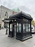 The main fare control for the IRT Eastern Parkway Line platforms is at the center of the station and is staffed.[164] On the northbound side, the overpasses have full height turnstiles leading to two staircases, one each flanking Brooklyn Borough Hall's main entrance on the northeast corner of Court and Joralemon Streets.[165] The stairs flanking Borough Hall retain cast-iron hoods atop granite bases, which are part of the original design. The Borough Hall station is one of two stations to retain such hoods, the other being the Wall Street station in Manhattan.[117]: 6 On the southbound side, the overpasses have small turnstile banks, leading to a token booth and two staircases, going up to the southeast corner of Court and Joralemon Streets.[157]: 4 [117]: 4 [165] The banisters on these staircases are made of concrete since they are outside the Brooklyn Municipal Building. The mezzanine has a large set of doors leading into the Municipal Building (this entrance was closed in February 1996 due to security concerns), and a now-defunct bank teller window. On the northwest corner of the mezzanine, a passage led to Borough Hall.[117]: 4