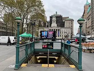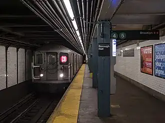 This article incorporates text from this source, which is in the public domain. - ^ Cox, Jeremiah (June 18, 2009). "Another view down the Manhattan-bound side platform at Borough Hall with its green columns and a Woodlawn-bound R142 4 train stopped in the station". subwaynut.com. Archived from the original on March 9, 2016. Retrieved August 6, 2017.