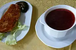 There are multiple examples of the soup in Ukrainian cuisine.[26][27] Virtually every oblast has its own version. Differences between particular varieties may regard the type of stock used (meat, bone, or both), the type of meat (beef, pork, poultry, etc.), the choice of vegetables and the method of cutting and cooking them. For example, although the typical recipe calls for beef and pork, the Kyiv variant uses mutton or lamb as well as beef, while in the Poltava region, the stock for borscht is cooked on poultry meat, that is, chicken, duck or goose. The use of zucchini, beans and apples is characteristic of the Chernihiv borscht; in this variant, beetroots are sautéed in vegetable oil rather than lard, and the sour taste comes solely from tomatoes and tart apples. The Lviv borscht is based on bone stock and is served with chunks of Vienna sausages.[28][29] In Southern Ukraine borshch typically includes legumes. Historically, borshch with meat was reserved as a holiday dish, meanwhile varieties consumed during lent would include fish, such as dried crucian carp.[30]