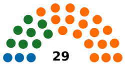 The Assembly elected at the 2019 local government elections, is made up of 29 counselors, with the following party composition:[1]