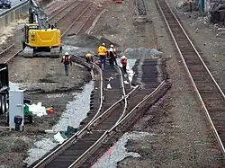A groundbreaking ceremony for the $20 million station was held on May 12, 2015, still with an expected opening in the fall of 2016.[7] Construction began in October 2015 with the removal of the three yard tracks at the station site. The inner part of the Framingham/Worcester Line was closed for a weekend in December 2015 to allow construction of a temporary shoo-fly track, which allows the mainline track to be removed during construction.[36] The mainline tracks were put back in service during a similar weekend shutdown in April 2017, restoring double track through Allston for the first time since the 1950s.[37]