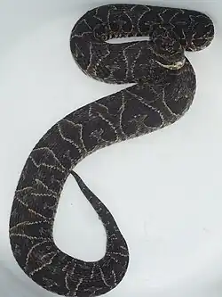 Bothrops jonathani has a maximum know svl of 800 mm (31 in).[5] It has a complex facial pattern which is made up of a wide, black edged, dark brown bands with white and tan stripes between them. The ventral scales have a white ground colour patterned with grey becoming greyer towards the grey undertail. The dorsal pattern has a tan ground colour with large cream blotches on the back and smaller brown blotches on the sides, these blotches vary in shape and between individuals.[3][5]