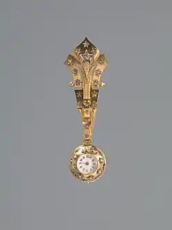 A Boule de Genève (Geneva ball) is a type of pendant watch in the shape of a small ball or sphere originating from Geneva, (Switzerland). The dial is usually at the bottom of the sphere facing the floor, at the opposite side of the jump ring on the upper part of the sphere, although there are examples with a front view face. Usually, they were arabic numeral dials, sometimes Roman, and from the 1950s different types of hour markers were also used. This objet de vertu frequently came with a matching brooch, chain or chatelaine.