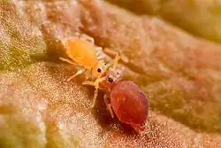 Male individuals of this family will search for females upon leaves, where they will then engage in a complex mating dance.[4] The mating dance begins with a male attaching to a female with a special appendage formed from a modified antennae, the females will then carry the smaller males.[5] This dance culminates with the female individual accepting a spermatophore from the male. In some cases, instead of accepting the spermatophore for reproductive purposes, the female will consume it.[4]
