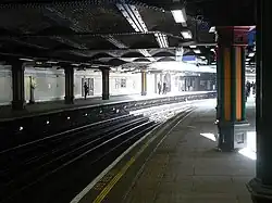 Bow Road station has two platforms, and marks the point where westbound trains from Upminster and Barking enter a tunnel; the gradient of the tunnel approach, which is to the east of the station, is 1 in 28, the steepest on the tube network.[9] The station platforms are below street level, where the western end of the platforms is in tunnel while the eastern end is in an open cutting.[10] Other stations on the District Line are designed in a similar way, such as High Street Kensington and Sloane Square.