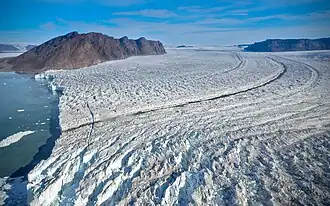 The Bowdoin Glacier discharges at the head of the Bowdoin Fjord from the Greenland Ice Sheet to the northeast of Prudhoe Land.[4][1]