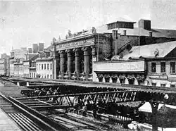 In 1860 Gilbert R. Spalding and Charles J. Rogers took a three-year lease on the Bowery Theatre, which they renovated and fitted with a movable stage so as to be able to cater for both equestrian and dramatic performances. Among their acts were the trapeze artists François and Auguste Siegrist and the tight-rope dancer Marietta Zanfretta.[23] In January 1861 they staged the spectacular Tippoo Sahib, or, the Storming of Seringapatam with many trick transformations including a vast enemy encampment, an Indian jungle near the Taj Mahal and a bombardment by British forces with a charge on foot and horse.[24]