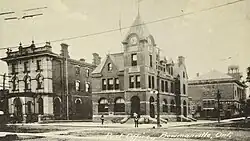 Burke later sold his land to Lewis Lewis. Lewis opened the first store in what was then called Darlington Mills. The store was purchased in about 1824 by Charles Bowman (for whom the town was eventually named) who then established the first post office.[5] Its first postmaster was Robert Fairbairn, who ran the post office from 1828 to 1857. Bowmanville incorporated as a town in 1858.[6]