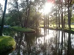 Boats are still available for rent on the lagoon, the fountain has been reinstalled, and the lagoon is used extensively for skating in the winter. In summer, the picnic sites and open spaces for ball games are popular, as is a mini-golf.[1] The modest redevelopment proposed in a 2008 plan began in June 2012.[7] However, the redevelopment was dealt a major setback with the June 2013 flood. Parts of the park were covered by as much as 1.5 meters of silt, as well as other debris. As a result, the redevelopment work that had been done so far was largely erased, and the work plan was modified in order to keep the reduce the impact of future floods. The park was closed for summer 2014.[8] The west half reopened in November 2014, and the east half of the park is expected to reopen in summer 2016.[1]