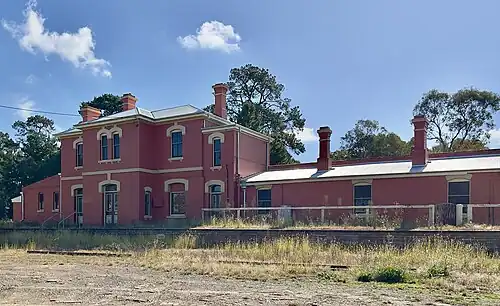 This is a substantial early station building from 1876 representing the enthusiasm and confidence of early station building design. It is typical of a number of buildings constructed on the southern line. The station complex also exhibits the changes that have taken place with duplication in 1913 and the addition of a platform at the rear of the building so that it became an island platform. The other buildings on the site allow the change in operation to be clearly seen. The station building is one of the few surviving combined station / residences and is of high significance in illustrating the development of the State railway system.[1]