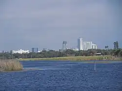 View of downtown St. Petersburg from boardwalk over protected wetlands
