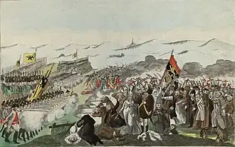The two factions soon clashed over the composition of the provincial assemblies which was "a conflict of which no peaceful solution existed" in the constitution.[28] The Statists accused the Vonckists of sharing the same views as the radicals of the French Revolution. The Statists succeeded in gaining support in a number of Patriotic Associations (Patriottische Maatschappij), similar to the "clubs" of Revolutionary France, which were composed of members of the wealthy classes.[32] By March 1790, the Vonckists had been forced out of Brussels by a mob.[33] An armed "crusade" of peasants, carrying crucifixes and led by priests, marched on Brussels in June to confirm their support of the Statists and to display rejection of the Enlightenment.[33] Influenced by the growing power of the radicals in France, the mob believed that the Vonckists were anti-clerical although this was probably untrue.[33]